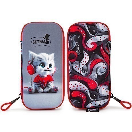 Жесткий пенал SkyName – это идеальный выбор для девочек! Изготовленный из 100% этиленвинилацетат/полиэстера, он украшен очаровательным принтом с котенком и наушниками. Нежная черная основа с яркими красными и серыми акцентами создает игривое и в то же время стильное настроение. На фотографиях видна аккуратная красная окантовка по краю и мягкая текстура ткани. Качество от бренда и внимание к деталям делают эту модель отличным выбором для вашего ребенка!