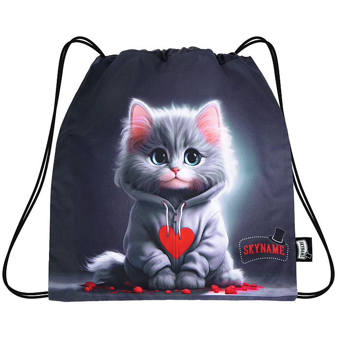 Мешок для обуви SkyName – это идеальный выбор для девочек! Изготовленный из 100% полиэстера, он украшен очаровательным принтом серого котенка в сером худи с красным сердцем. Нежная ткань и яркий принт создают уютное и в то же время стильное настроение. На фотографии видна аккуратная черная окантовка по краю и удобная ручка для переноски. Качество от бренда SkyName и внимание к деталям делают этот мешок отличным выбором для вашего ребенка!