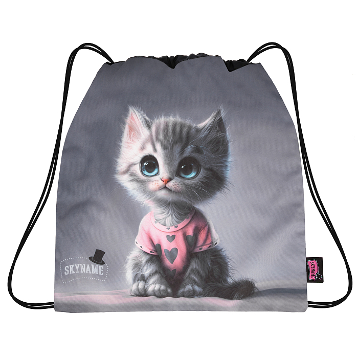 Мешок для обуви SkyName – это идеальный выбор для девочек! Изготовлен из 100% полиэстера, он украшен очаровательным принтом котенка в розовом платье. Милый котенок с голубыми глазами и серыми полосками на фоне серого мешка создает нежное и в то же время уютное настроение. На фотографиях видна аккуратная розовая окантовка по краю и мягкая текстура ткани. Качество от бренда и внимание к деталям делают этот мешок отличным выбором для вашего ребенка!