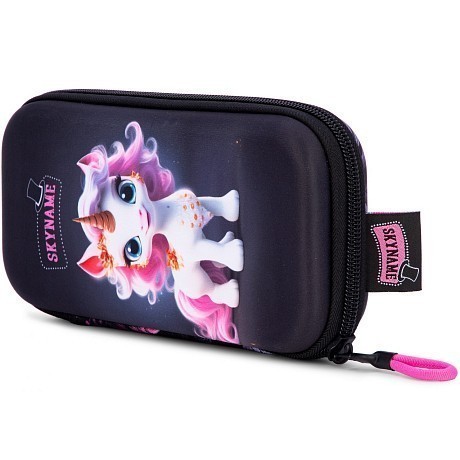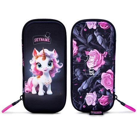 Жесткий пенал для девочки SkyName – это идеальный выбор для девочек! Изготовлен из 100% этиленвинилацетат/полиэстер, он украшен очаровательным принтом единорога и роз. Нежная черная основа с яркими розовыми и белыми акцентами создает игривое и в то же время уютное настроение. На фотографиях видна аккуратная розовая окантовка по краю и мягкая текстура ткани. Качество от бренда SkyName делает этот пенал отличным выбором для вашего девочки!