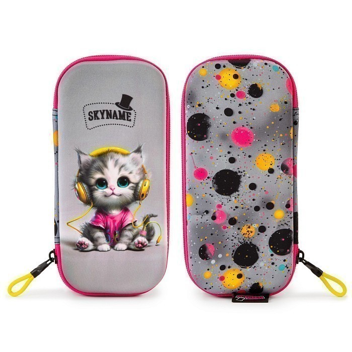 Жесткий пенал SkyName – это идеальный выбор для девочек! Изготовленный из 100% этиленвинилацетат/полиэстера, он украшен очаровательным принтом с котенком в желтых наушниках и яркими разноцветными брызгами. Серый фон с яркими цветами создает стильный и современный образ. На фотографиях видна аккуратная розовая окантовка по краю и удобная застежка на молнии. Качество от бренда SkyName и внимание к деталям делают этот пенал отличным выбором для вашего ребенка!