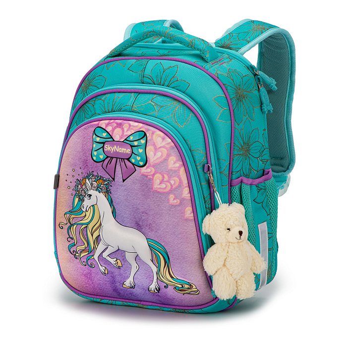 Ранец+брелок мишка SkyName – это идеальный выбор для маленьких модниц! Изготовленный из 100% полиэстера, он украшен очаровательным изображением единорога с цветочным венком и сердечками. Благодаря яркому дизайну и удобной посадке, ранец будет идеальным аксессуаром для школы. На фотографиях видна мягкая текстура ткани, удобная ручка и брелок в виде мишки. Качество от бренда SkyName делает этот ранец отличным выбором для вашего ребенка!