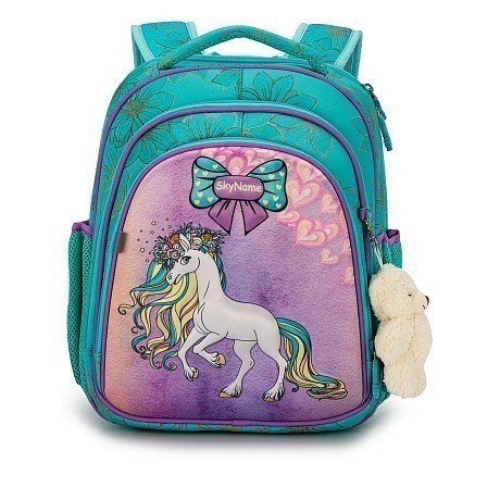 Ранец+брелок мишка SkyName – это идеальный выбор для маленьких модниц! Изготовленный из 100% полиэстера, он украшен очаровательным изображением единорога с цветочным венком и сердечками. Благодаря яркому дизайну и удобной посадке, ранец будет идеальным аксессуаром для школы. На фотографиях видна мягкая текстура ткани, удобная ручка и брелок в виде мишки. Качество от бренда SkyName делает этот ранец отличным выбором для вашего ребенка!