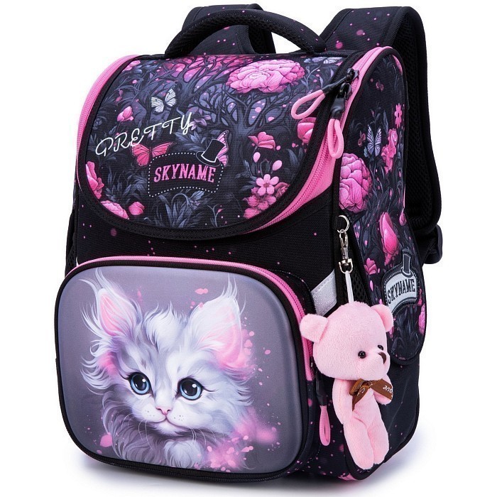 Ранец+брелок мишка SkyName – это идеальный выбор для маленьких модниц! Изготовленный из 100% полиэстера, он украшен очаровательным изображением котенка с голубыми глазами и розовыми бабочками на фоне цветов. Стильный дизайн и качественные материалы делают этот ранец отличным аксессуаром для девочек. На фотографиях видна аккуратная розовая окантовка по краю и мягкая текстура ткани. Качество от бренда SKYNAME и внимание к деталям делают эту модель идеальным выбором для вашего ребенка!