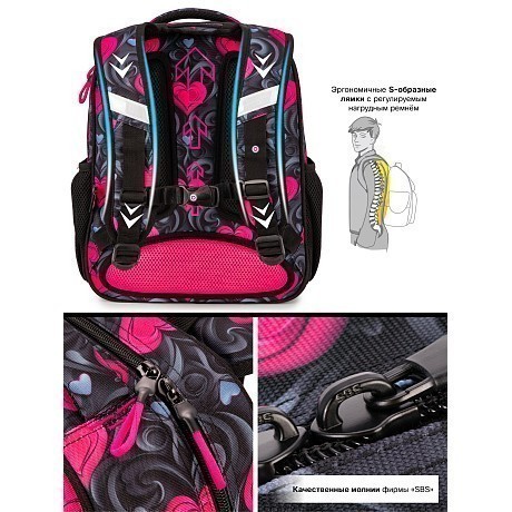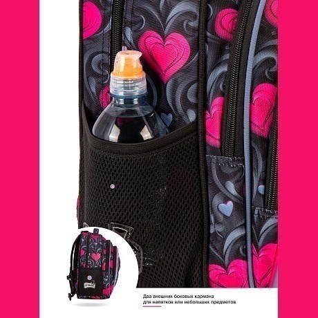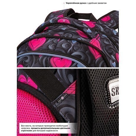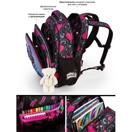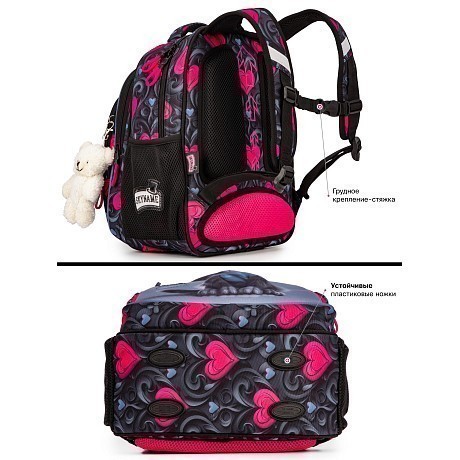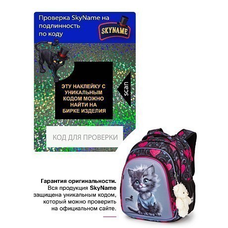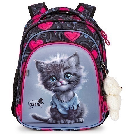 Рюкзак+брелок SkyName – это идеальный выбор для маленьких модниц! Изготовленный из 100% этиленвинилацетат/полиэстера, он украшен очаровательным принтом с милым котиком и сердечками. Черный фон с яркими розовыми сердечками и изображением котика создает игривое и в то же время уютное настроение. На фото видна аккуратная розовая окантовка по краю и мягкая текстура ткани. Качество от бренда SKYNAME и внимание к деталям делают этот рюкзак отличным выбором для вашего ребенка!