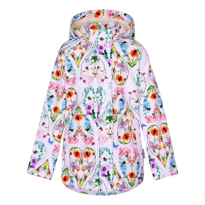 Куртка для девочки Molo – это идеальный выбор для весенне-осеннего периода! Изготовленная из 50% переработанного полиэстера и 50% полиэстера, она украшена ярким цветочным принтом с бабочками и мелкими цветочками на белом фоне. Куртка с капюшоном и удобной застежкой-молнией обеспечивает тепло и комфорт для вашего ребенка. На фотографиях видна аккуратная застежка-молния по центру и мягкая текстура ткани. Качество от бренда из Дании и внимание к деталям делают эту куртку отличным выбором для вашего малыша!