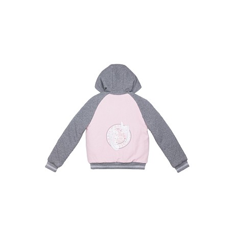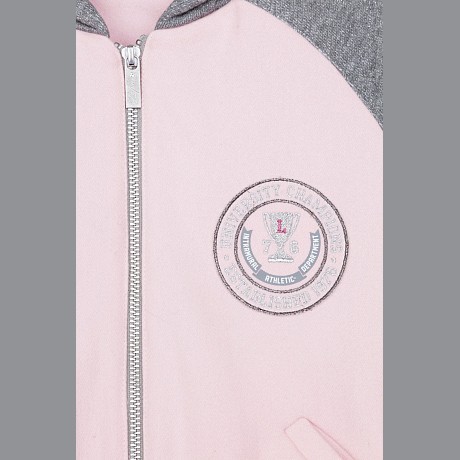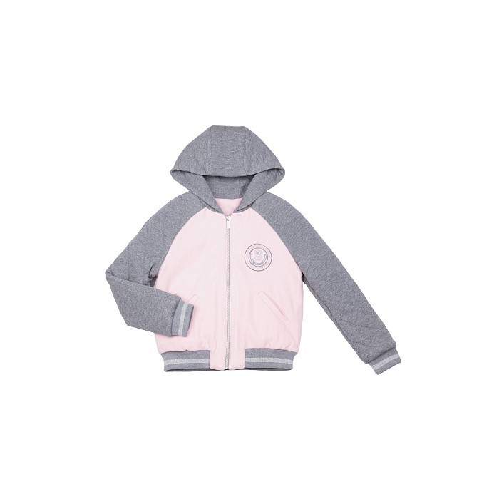 - 🎨 Дизайн: капюшон, металлический логотип, серые рукава, розовая основная часть