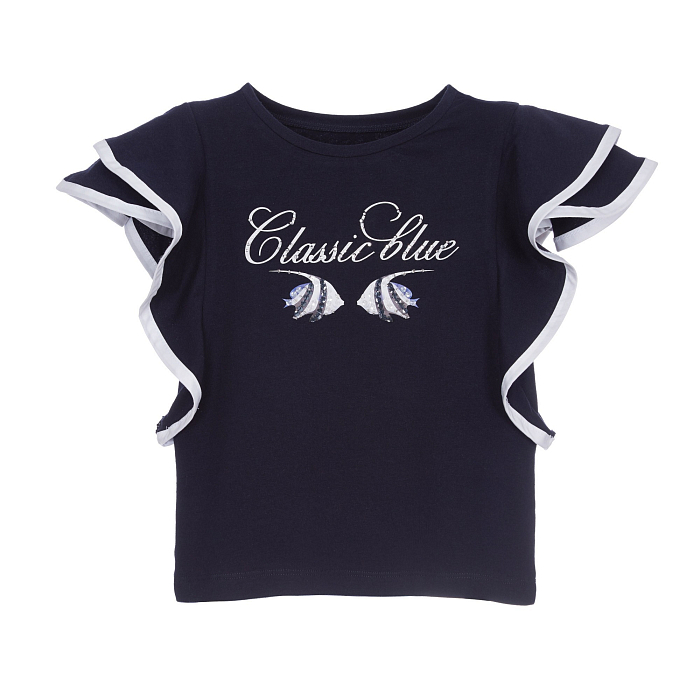 Блуза-топ Lapin House – это идеальный выбор для стильных девочек! Изготовленная из 94% хлопка и 6% эластана, она украшена оригинальным принтом Classic Blue с изображением двух рыбок и надписью Classic Blue. Белые воланы на рукавах добавляют блузке нежности и оригинальности. Нежная ткань и удобная посадка делают эту блузу-топ отличным выбором для вашего ребенка!