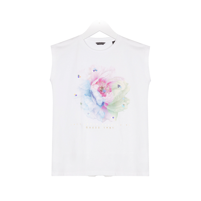 Блузка Guess – это идеальный выбор для девочек! Изготовленная из 95% хлопка и 5% других волокон, она украшена ярким цветочным принтом с нежными розовыми, голубыми и зелеными оттенками. Блузка с круглым вырезом и без рукавов создает легкую и удобную посадку, подчеркивая нежность и изысканность вашего ребенка. На фотографии видна аккуратная отделка по краю и мягкая текстура ткани. Качество от бренда Guess и внимание к деталям делают эту блузку отличным выбором для вашего девочки!
