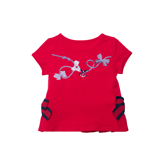 Футболка Lapin House – это идеальный выбор для девочек! Изготовленная из 94% хлопка и 6% эластана, она украшена очаровательным принтом медведя и бантиков. Красная основа с белыми и синими акцентами создает игривое и в то же время уютное настроение. На фотографии видна аккуратная белая контрастная окантовка по краю и мягкая текстура ткани. Качество от бренда из Греции и внимание к деталям делают эту футболку отличным выбором для вашего ребенка!