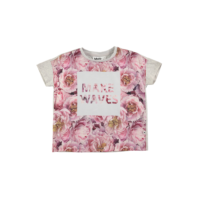 Футболка Molo – это идеальный выбор для девочек! Изготовленная из комбинации 60% хлопка и 40% вискозы, она украшена очаровательным цветочным принтом и надписью Make Waves. Нежные розовые и белые цветы создают нежное и романтичное настроение. На фотографии видна аккуратная серая окантовка по краю и мягкая текстура ткани. Качество от бренда из Китая и внимание к деталям делают эту футболку отличным выбором для вашего ребенка!