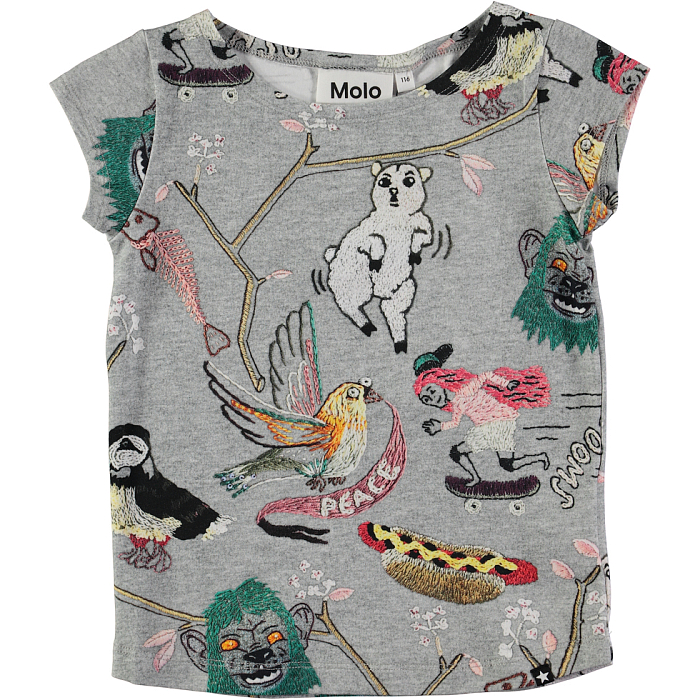 Футболка Molo – это идеальный выбор для маленьких модниц! Изготовленная из 95% хлопка и 5% эластана, она украшена вышивкой с изображениями животных и птиц. На футболке изображены милые львы, птицы, собаки и другие забавные персонажи, которые создают веселую и уютную атмосферу. Нежная текстура ткани и удобная посадка делают эту футболку отличным выбором для вашего ребенка!