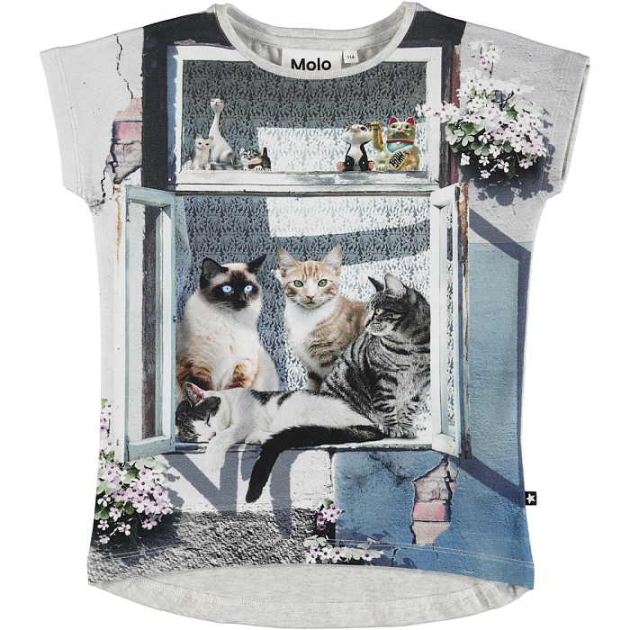 Футболка Molo – это идеальный выбор для девочек! Изготовленная из 95% хлопка и 5% эластана, она украшена очаровательными кошками на фоне окна. Нежная текстура ткани и удобная посадка делают эту футболку отличным выбором для вашего ребенка. На фотографиях видны милые кошки разных пород, сидящие на подоконнике, и красивые цветы в горшках. Качество от бренда из Украины и внимание к деталям делают эту футболку отличным выбором для вашего малыша!