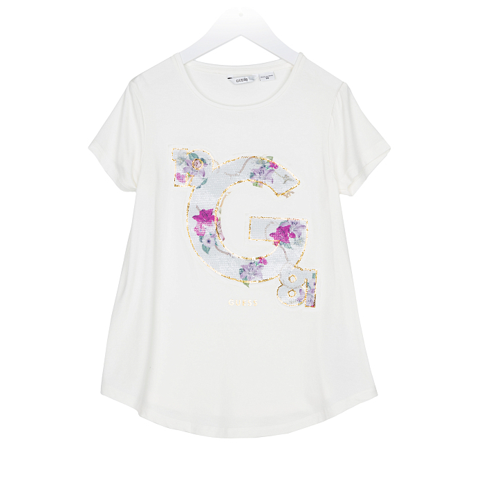 Футболка Guess – это идеальный выбор для маленьких модниц! Изготовленная из комбинации вискозы и эластана, она украшена цветочным принтом и зеркальными пайетками. Футболка Guess – это стиль и комфорт в одном флаконе! На фотографии видна яркая цветочная композиция на белом фоне, а также зеркальные пайетки, которые придают футболке блеск и шикарный вид. Качество от бренда из Индии и внимание к деталям делают эту футболку отличным выбором для вашего ребенка!
