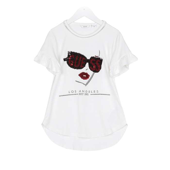 Футболка Guess – это идеальный выбор для маленьких модниц! Изготовленная из комбинации 93% вискозы и 7% эластана, она обеспечивает комфорт и свободу движений. Яркий принт с надписью "Guess" и изображением солнцезащитных очков, розовых губ и улыбки делает эту футболку не только стильной, но и очень привлекательной. Эластичные рукава и круглый вырез делают её удобной для носки. Качество от бренда из Индии и внимание к деталям делают эту футболку отличным выбором для вашего ребенка!