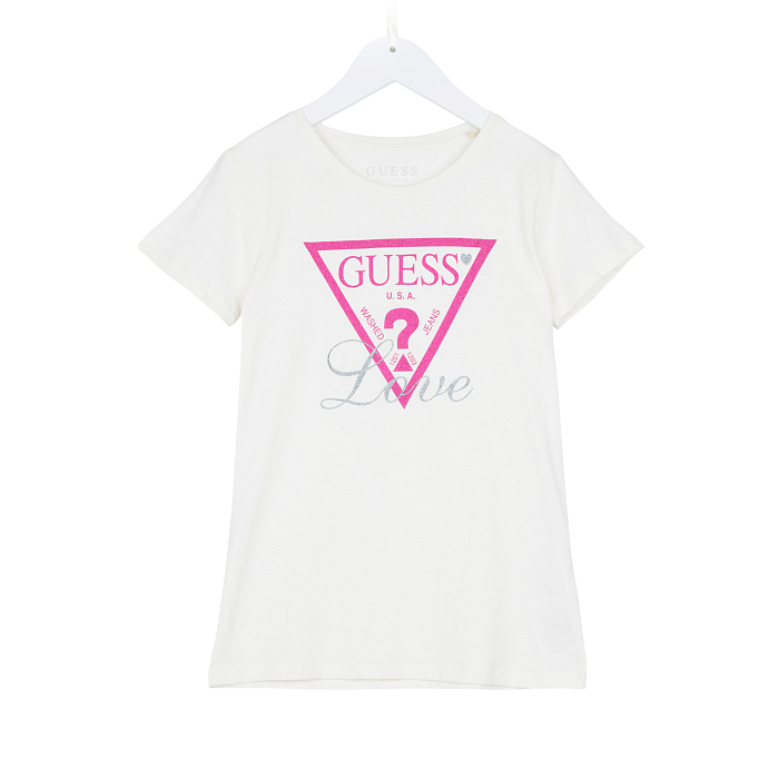 Футболка Guess для девочек – это идеальный выбор для стильных и современных девочек! Изготовленная из 100% хлопка, она украшена ярким принтом Guess Love в виде розового треугольника с надписью "Guess" и "Love" в серебристом цвете. Принт дополнен символом Guess и надписью "Washed 1993 Jeans" в серебристом цвете. Футболка с круглым вырезом горловины и короткими рукавами идеально подойдет для повседневной носки. На фотографии видна аккуратная вышивка и мягкая текстура ткани. Качество от бренда из Бангладеш и внимание к деталям делают эту футболку отличным выбором для вашего ребенка!