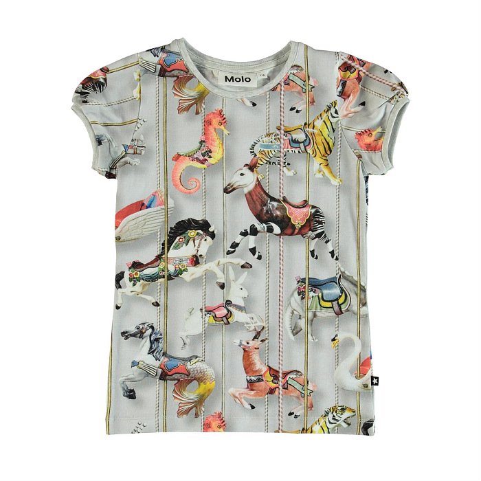 Футболка Molo – это идеальный выбор для девочек! Изготовленная из 95% хлопка и 5% эластана, она украшена очаровательными животными на карусели. На футболке изображены яркие и разнообразные животные, такие как лошади, зайцы, птицы и даже рыбы, которые висят на веревках. Нежная ткань и удобная посадка делают эту футболку комфортной и стильной. Качество от бренда из Украины и внимание к деталям делают эту футболку отличным выбором для вашего ребенка!