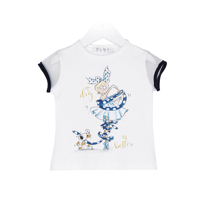 Футболка Elsy – это идеальный выбор для маленьких модниц! Изготовленная из 95% хлопка и 5% эластана, она дополнена стильным принтом балерины и собаки. Футболка с белым фоном, украшенная синими и белыми точками, создает нежное и в то же время забавное настроение. На фотографии видна аккуратная синяя контрастная окантовка по краю и мягкая текстура ткани. Качество от бренда из Италии и внимание к деталям делают эту футболку отличным выбором для вашего ребенка!