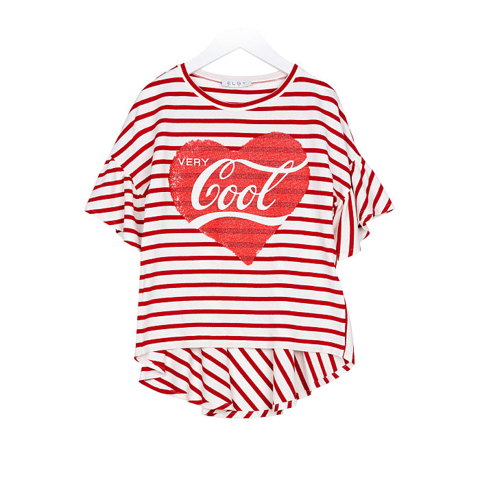 Футболка Elsy – это идеальный выбор для маленьких модниц! Изготовленная из комбинации вискозы, эластана, полиамида и полиэстера, она украшена красным принтом сердца с надписью Very Cool. Нежная вискоза и эластичный эластан обеспечивают комфорт и свободу движений. На фотографии видна аккуратная текстура ткани, мягкая воротничок и удобная посадка. Качество от итальянского бренда Elsy делает эту футболку отличным выбором для вашего ребенка!