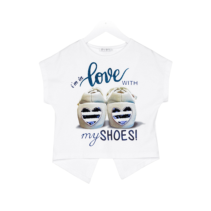 Футболка Elsy – это идеальный выбор для девочек! Изготовленная из 95% хлопка и 5% эластана, она украшена очаровательными сердечками и надписью "I'm in love with my shoes". Нежная белая основа с яркими сердечками и надписью создает игривое и в то же время уютное настроение. На фотографии видна аккуратная белая окантовка по краю и мягкая текстура ткани. Качество от бренда из Италии и внимание к деталям делают эту футболку отличным выбором для вашего ребенка!