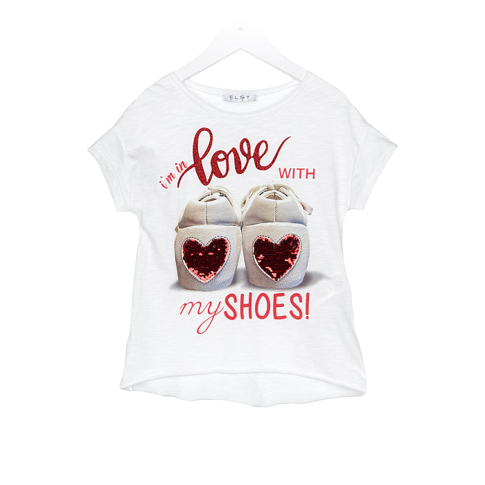 Футболка Elsy – это идеальный выбор для маленьких модниц! Изготовленная из 100% хлопка, она украшена очаровательными сердечками и надписью 'I'm in love with my shoes'. Нежная белая основа с яркими красными сердечками создает игривое и влюбленное настроение. На фотографии видна аккуратная надпись и изображение туфельок с сердечками. Качество от бренда из Италии и внимание к деталям делают эту футболку отличным выбором для вашего ребенка!