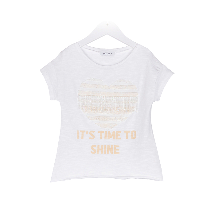 Футболка Elsy – это идеальный выбор для девочек! Изготовленная из 100% хлопка, она украшена очаровательным принтом сердца с надписью 'It's time to shine'. Нежная белая основа с изящным сердечком и надписью создает нежное и в то же время стильное настроение. На фотографии видна аккуратная вышивка и мягкость ткани. Качество от бренда из Италии и внимание к деталям делают эту футболку отличным выбором для вашего ребенка!