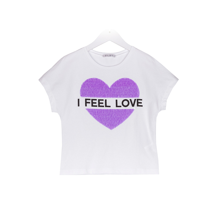 Футболка Elsy – это идеальный выбор для маленьких модниц! Изготовленная из 95% хлопка и 5% эластана, она украшена очаровательным принтом сердца с надписью I FEEL LOVE. Футболка с круглым вырезом и короткими рукавами создает комфорт и стиль. На фотографии видна яркая фиолетовая вышивка сердца и надпись, а также мягкая текстура ткани. Качество от итальянского бренда и внимание к деталям делают эту футболку отличным выбором для вашего ребенка!