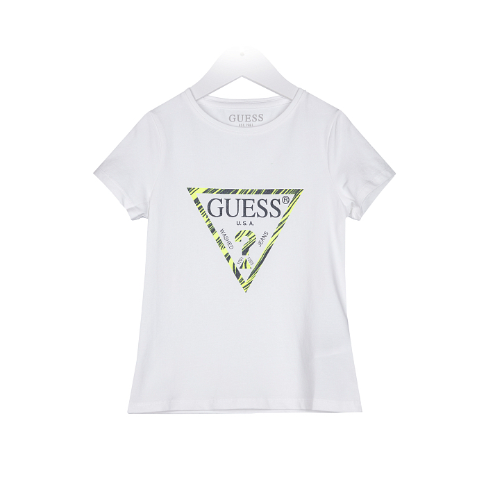 Футболка Guess для девочек – это стильный и удобный выбор! Изготовлена из 95% хлопка и 5% эластана, она идеально подойдет для активного отдыха и игр. Футболка украшена ярким принтом Guess в виде треугольника с контрастными линиями и надписью "WASHED" и "JEANS". Нежная белая основа с ярким принтом создает модный и современный образ. На фотографии видна округлая горловина и короткие рукава, а также мягкая текстура ткани. Качество от бренда из Индии и внимание к деталям делают эту футболку отличным выбором для вашего ребенка!