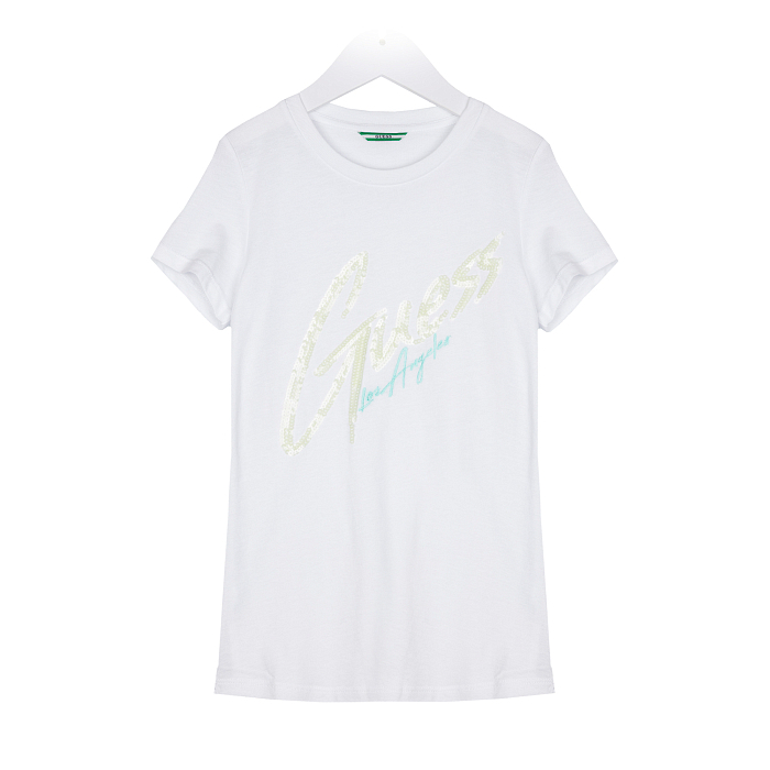 Футболка Guess – это идеальный выбор для девочек! Изготовленная из 60% хлопка и 40% модала, она украшена стильным логотипом Guess. Белая основа с зеленым контрастом и логотипом создает модный и нежный образ. На фотографии видна аккуратная зеленая окантовка по краю и мягкая текстура ткани. Качество от бренда из Китая и внимание к деталям делают эту футболку отличным выбором для вашего ребенка!
