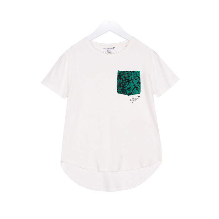 Футболка Guess – это идеальный выбор для стильных девочек! Изготовленная из комбинации вискозы и эластана, она украшена зеленым принтом змейки и логотипом Guess. Нежная белая основа с ярким зеленым принтом создает модный и в то же время удобный наряд. На фотографии видна аккуратная зеленая контрастная окантовка по краю кармана и мягкая текстура ткани. Качество от бренда из США и внимание к деталям делают эту футболку отличным выбором для вашего ребенка!