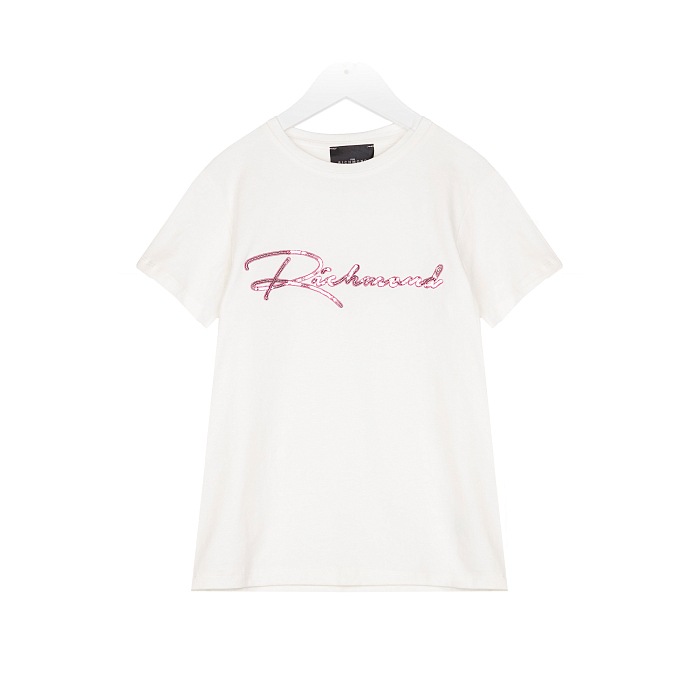 Футболка для девочки John Richmond – это идеальный выбор для стильных и комфортных образов! Изготовленная из 95% хлопка и 5% эластана, она обеспечивает идеальную посадку и мягкость. Футболка украшена элегантным логотипом John Richmond, который выделяется на белом фоне. Нежная текстура ткани и эластичная резинка по горловине делают эту футболку удобной и стильной. На фотографии видна аккуратная вышивка логотипа и эластичная резинка по горловине.