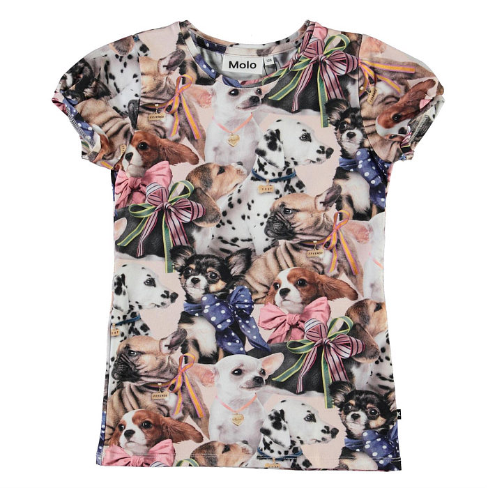 Футболка Molo – это идеальный выбор для маленьких модниц! Изготовленная из 95% органического хлопка и 5% эластана, она украшена очаровательными изображениями разных пород собак с бантиками. Нежная текстура ткани и удобная посадка делают эту футболку комфортной и стильной. На фотографиях видны разнообразные породы собак, украшенные разноцветными бантиками, что создает яркий и веселый образ. Качество от датского бренда и внимание к деталям делают эту футболку отличным выбором для вашего ребенка!