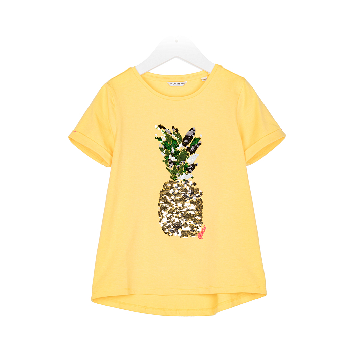 Футболка Guess – это идеальный выбор для маленьких модниц! Изготовленная из 95% хлопка и 5% других волокон, она украшена ярким дизайном ананаса из пайеток. Желтый цвет и зеленые пайетки создают яркий и веселый образ. На фотографии видна аккуратная отделка по краю и мягкая текстура ткани. Качество от бренда из США и внимание к деталям делают эту футболку отличным выбором для вашего ребенка!