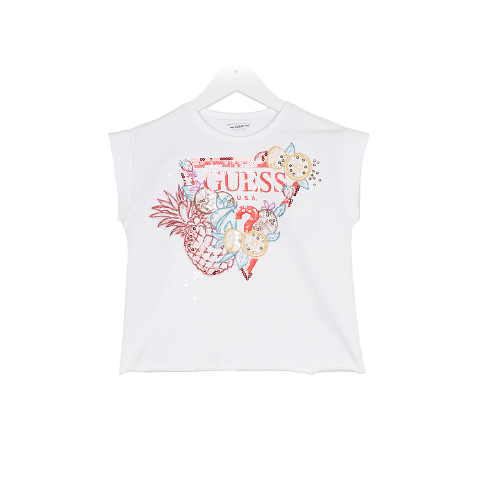 Футболка Guess – это идеальный выбор для маленьких модниц! Изготовленная из 95% хлопка и 5% других волокон, она украшена ярким принтом с фруктами, включая ананас, лимон, апельсин и клубнику. На белом фоне принт выглядит особенно нарядно и привлекательно. Футболка с круглым вырезом и короткими рукавами подчеркивает стиль и комфорт. Качество от бренда Guess и внимание к деталям делают эту футболку отличным выбором для вашего ребенка!