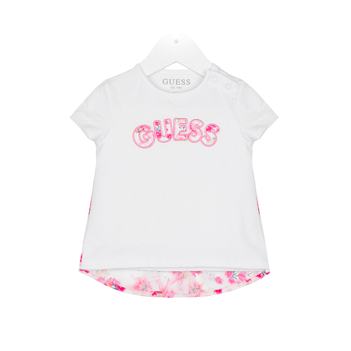 Футболка Guess для девочек – это стильный и удобный выбор для вашего ребенка! Изготовлена из 95% хлопка и 5% других волокон, она идеально подходит для теплой погоды. На футболке крупный принт Guess в розовых тонах, который создает яркий и современный образ. Футболка с короткими рукавами и круглым вырезом горловины обеспечивает отличную посадку и комфорт. На изображении видна яркая надпись Guess с цветочным принтом, а также контрастная окантовка по краю. Качество материала и деталировка делают эту футболку отличным выбором для вашего ребенка!