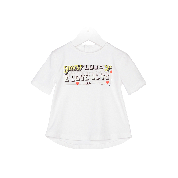 Футболка для девочек Guess – это идеальный выбор для маленьких модниц! Изготовленная из 95% хлопка и 5% эластана, она украшена очаровательным принтом Love и сердечками. Нежная белая основа с яркими надписями и сердечками создает игривое и вдохновляющее настроение. На фотографии видна аккуратная застежка на кнопки и мягкая текстура ткани. Качество от бренда из США и внимание к деталям делают эту футболку отличным выбором для вашего малыша!