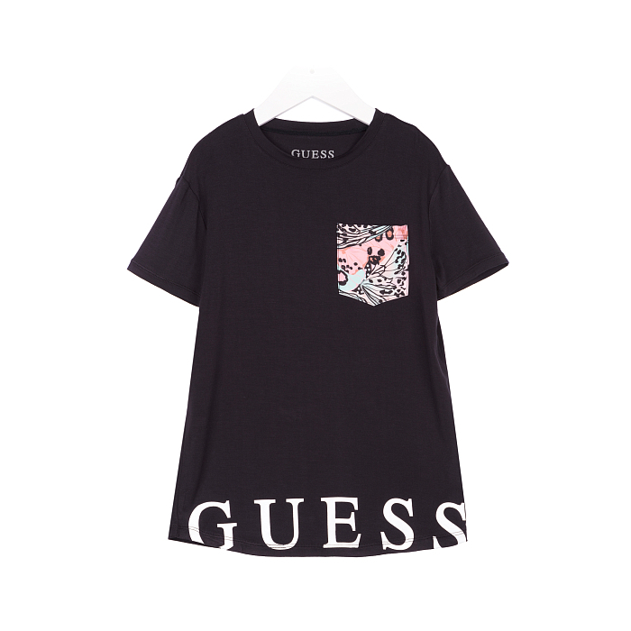 Футболка Guess – это идеальный выбор для маленьких модниц! Изготовленная из 95% вискозы и 5% эластана, она обеспечивает мягкость и комфорт для нежной кожи. Футболка украшена стильным принтом с цветочным узором в нежных оттенках розового и бежевого на черном фоне. На груди расположен карман с принтом, который добавляет оригинальности и шарма. Футболка Guess – это премиум качество из США, которое идеально подойдет для вашего ребенка!