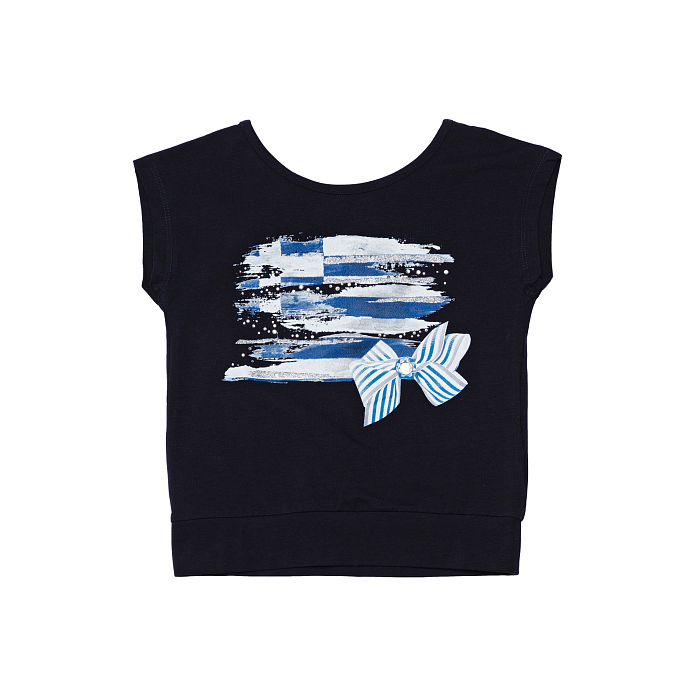 Топ для девочек Lapin House – это идеальный выбор для вашего маленькой модницы! Изготовленный из 94% хлопка и 6% эластана, он украшен оригинальным принтом флага Греции и красивым бантом. Нежная черная основа с яркими голубыми и белыми полосами и бантом создает яркий и стильный образ. На фотографиях видна аккуратная детализация банта с бриллиантом и мягкая текстура ткани. Качество от бренда из Греции и внимание к деталям делают этот топ отличным выбором для вашего ребенка!