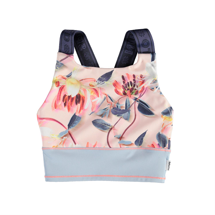 Топ для девочки Molo – это идеальный выбор для стильных и комфортных выходов! Изготовленный из 79% полиэстера и 21% эластана, он обеспечивает идеальную посадку и свободу движений. Топ украшен нежным цветочным принтом с яркими розовыми и желтыми цветами на светло-розовом фоне. На фото видна аккуратная голубая окантовка по краю и мягкая текстура ткани. Качество от датского бренда Molo и внимание к деталям делают эту модель отличным выбором для вашего ребенка!