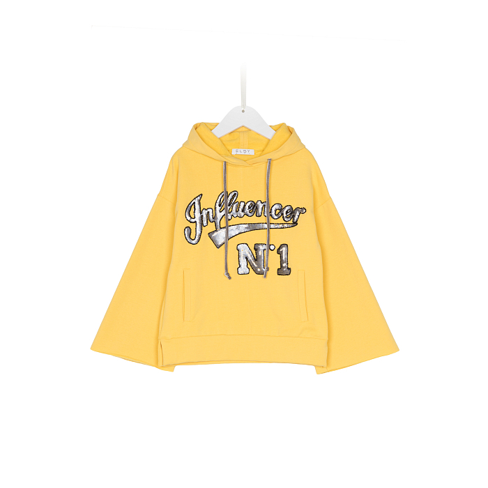 Джемпер Elsy – это идеальный выбор для стильных девочек! Изготовленный из 95% хлопка и 5% эластана, он украшен ярким принтом с надписью "Influencer N°1". Нежный желтый цвет и стильный принт создают неповторимый образ. На фотографии видна удобная посадка, мягкая ткань и эластичные шнурки для регулировки капюшона. Качество от итальянского бренда и внимание к деталям делают этот джемпер отличным выбором для вашего ребенка!
