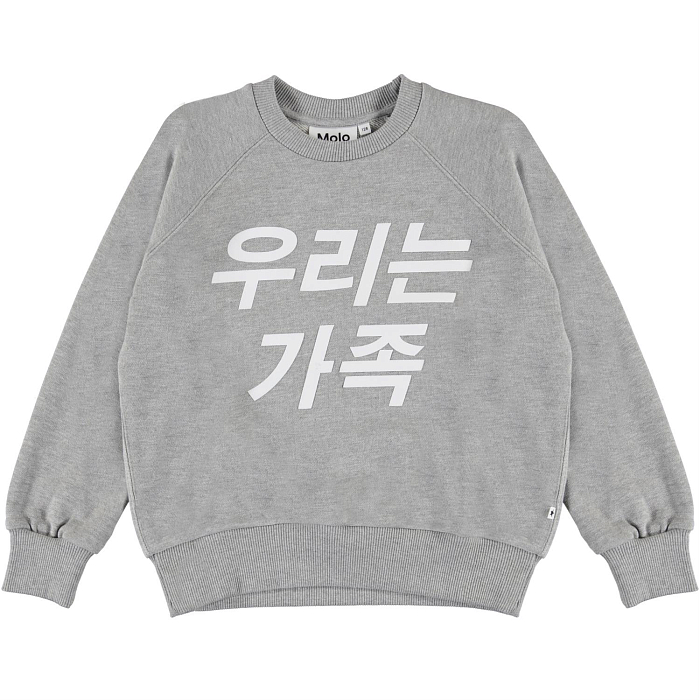 Джемпер для девочек Molo – это идеальный выбор для стильных и комфортных образов! Изготовленный из 70% хлопка и 30% вискозы, он украшен оригинальным принтом '우리는 가족' (Мы – семья) на сером фоне. Нежная ткань с мягкой воротничной окантовкой и эластичными манжетами обеспечивает идеальную посадку и комфорт. Качество от бренда из Индии делает этот джемпер отличным выбором для вашего ребенка!
