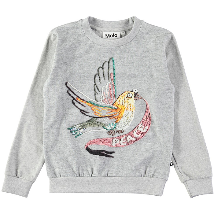 Футболка с длинным рукавом Molo – это идеальный выбор для девочек! Изготовленная из 95% хлопка и 5% эластана, она украшена очаровательным принтом голубя с надписью PEACE. Нежная серая основа с ярким принтом создает уютное и в то же время стильное настроение. На фотографии видна аккуратная контрастная окантовка по краю и мягкая текстура ткани. Качество от бренда из Украины и внимание к деталям делают эту футболку отличным выбором для вашего ребенка!