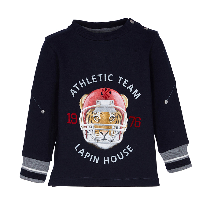 Джемпер Lapin House – это идеальный выбор для активных мальчиков! Изготовленный из 95% хлопка и 5% лайкры, он украшен очаровательным принтом тигра в красном футбольном шлеме и надписью Athletic Team. Нежная ткань с ярким принтом создает спортивный и модный образ. На фотографии видна аккуратная окантовка по краю рукавов и мягкая текстура ткани. Качество от бренда из Греции и внимание к деталям делают этот джемпер отличным выбором для вашего мальчика!