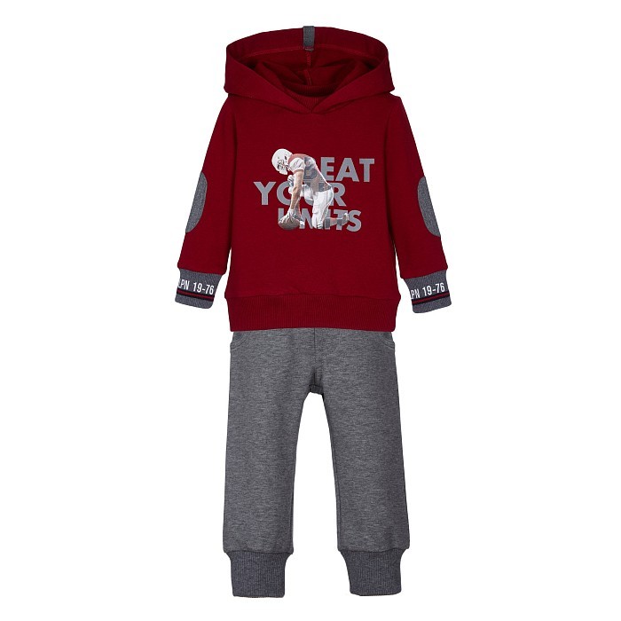 Комплект тренировочный Lapin House – идеальный выбор для мальчиков! Изготовлен из высококачественного хлопка с добавлением лайкры и такелья, он обеспечивает отличную посадку и комфорт. Джемпер и брюки выполнены в спортивном стиле, украшенные надписью "Beat Your Limits" и изображением игрока. Нежный серый цвет брюк с красной окантовкой создает стильный и современный образ. На фотографиях видна удобная посадка, мягкая текстура ткани и аккуратные швы. Качество от бренда из Греции и внимание к деталям делают этот комплект отличным выбором для вашего ребенка!