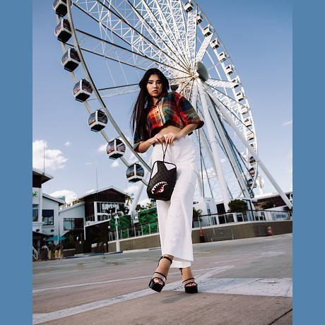 - 🎨 Дизайн: клетчатый узор, принт акулы, удобная ручка, застежка