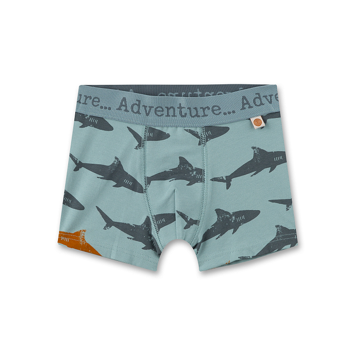 Трусы Sanetta – это идеальный выбор для юных мореплавателей! Изготовленные из 95% хлопка и 5% эластана, они украшены очаровательным принтом акул и надписью Adventure. Нежная голубая основа с черными акулами и белыми надписями создает игривое и вдохновляющее настроение. На фотографиях видна аккуратная голубая контрастная окантовка по краю и мягкая текстура ткани. Качество от бренда из Германии и внимание к деталям делают эти трусы отличным выбором для вашего мальчика!