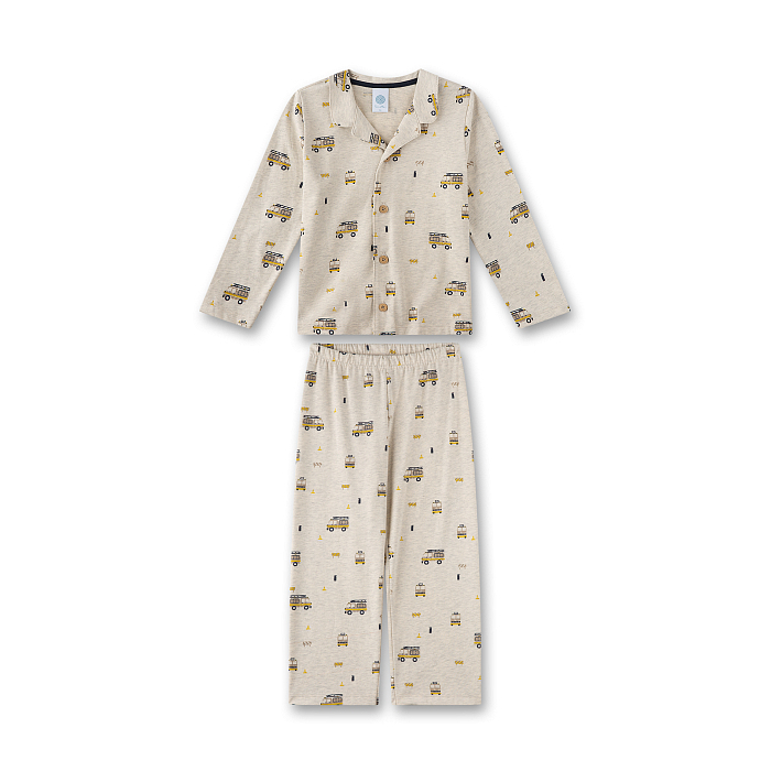 Пижама Sanetta – это идеальный выбор для мальчиков! Изготовленная из 100% хлопка, она украшена очаровательными желтыми автобусами на бежевом фоне. Нежная бежевая основа с яркими желтыми автобусами создает игривое и в то же время уютное настроение. На фотографиях видна удобная застежка на пуговицы и эластичная резинка по низу брюк. Качество от бренда и внимание к деталям делают эту пижаму отличным выбором для вашего ребенка!