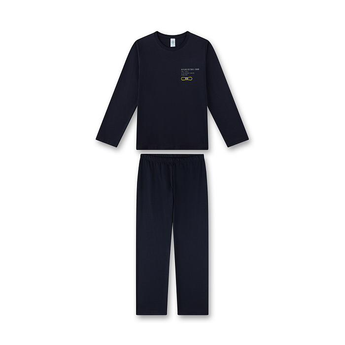 Пижама Sanetta – идеальный выбор для детей! Изготовленная из 100% хлопка, она выполнена в темно-синем цвете с стильным принтом на футболке и брюках. Футболка с длинными рукавами и круглым вырезом горловины, а также брюки с эластичной резинкой на талии обеспечивают комфортную посадку и удобство. На футболке виден стильный принт с надписями и логотипом, а на брюках – яркий желтый принт с надписями. Качество и стиль от бренда Sanetta делают эту пижаму отличным выбором для вашего ребенка!