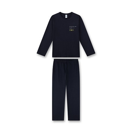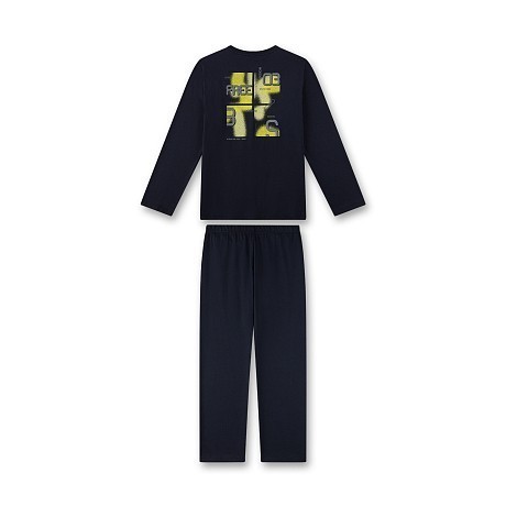Пижама Sanetta – идеальный выбор для детей! Изготовленная из 100% хлопка, она выполнена в темно-синем цвете с стильным принтом на футболке и брюках. Футболка с длинными рукавами и круглым вырезом горловины, а также брюки с эластичной резинкой на талии обеспечивают комфортную посадку и удобство. На футболке виден стильный принт с надписями и логотипом, а на брюках – яркий желтый принт с надписями. Качество и стиль от бренда Sanetta делают эту пижаму отличным выбором для вашего ребенка!