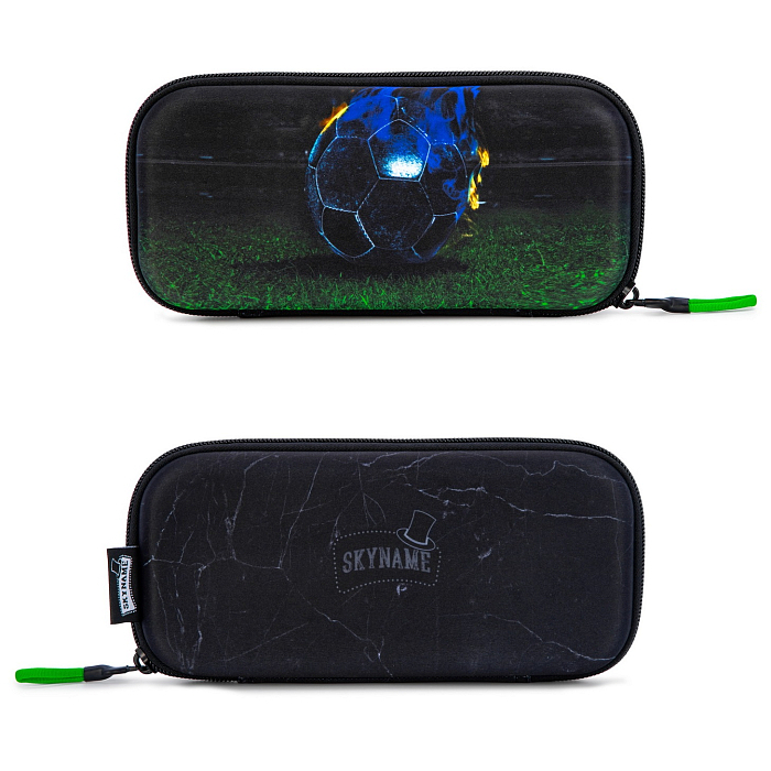 Жесткий пенал SkyName – это идеальный выбор для юных спортсменов! Изготовлен из прочного материала 100% этиленвинилацетат/полиэстер, он надежно защищает все необходимые канцелярские принадлежности. Футбольный принт с ярким изображением мяча и огненными эффектами делает пенал не только практичным, но и очень стильным. Логотип бренда на передней панели и зеленая ручка на молнии делают его еще более привлекательным. Пенал идеально подходит для школы и спортивных занятий, обеспечивая удобство и порядок в любых условиях.